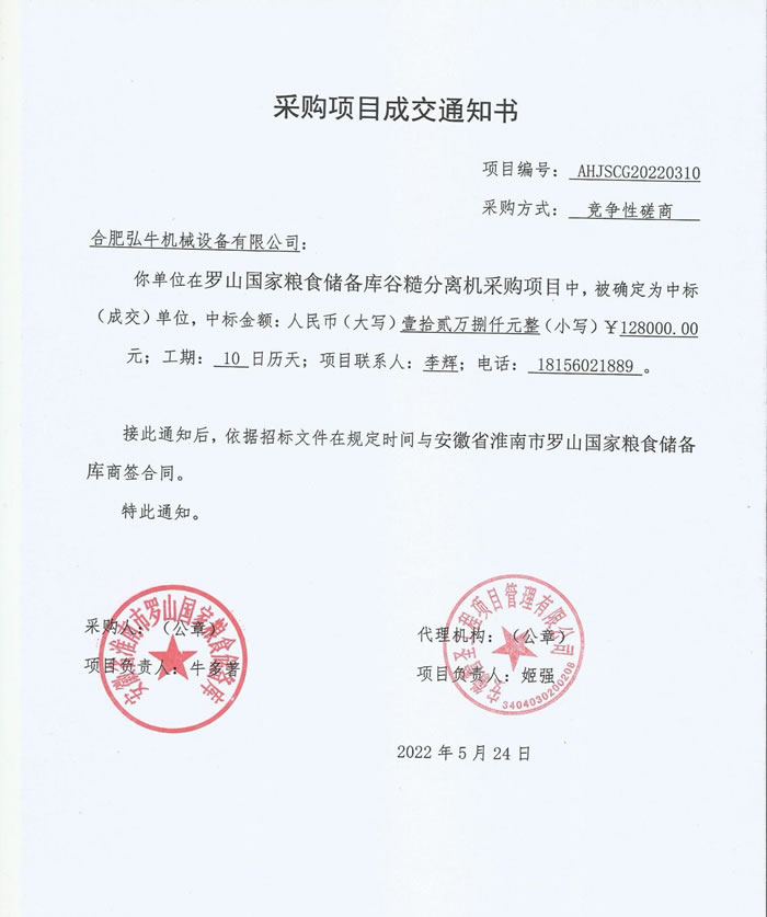 2022年5月,我公司經(jīng)過(guò)競(jìng)爭(zhēng)談判,中標(biāo)“羅山國(guó)家儲(chǔ)備庫(kù)谷糙分離機(jī)采購(gòu)項(xiàng)目”。機(jī)械順利驗(yàn)收交貨。